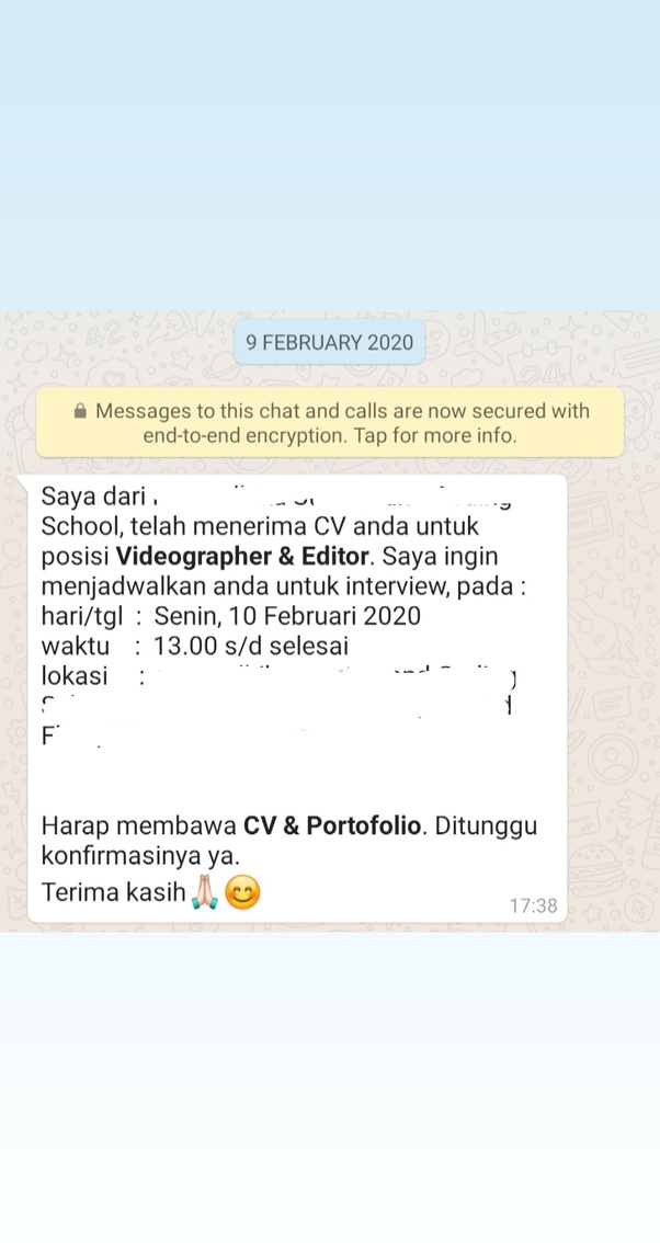 Contoh panggilan kerja dan interview yang asli dan palsu via sms . Surat panggilan kerja dapat berupa keterangan yang menyatakan bahwa si pelamar sudah diterima bekerja di perusahaan, atau dapat juga berisi undangan untuk . Simak tips dan contoh cara membalas email panggilan interview kerja dengan profesional berikut ini. Blkg an ini kayanya lg banyak ya yg dpt panggilan interview palsu by wa, temen2 ada yg tau. Contoh surat lamaran kerja via whatsapp paint colors 2019.
