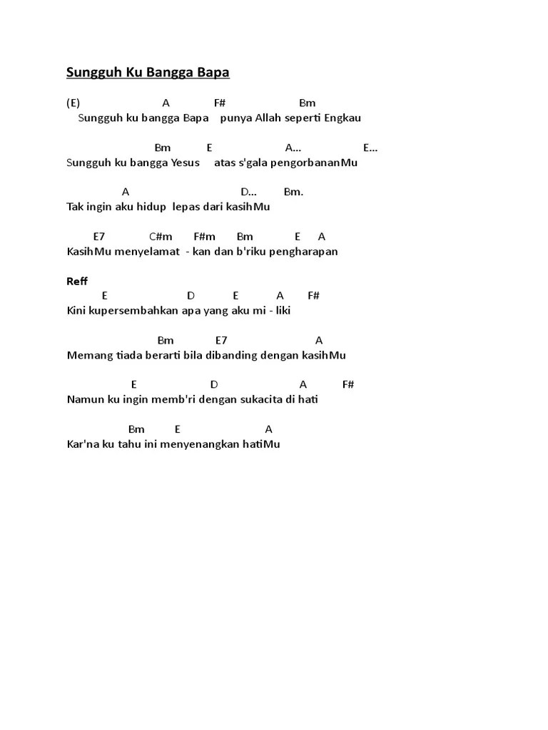 Sungguh ku bangga bapa punya allah seperti engkau sungguh ku bangga yesus atas s'gala pengorbananmu,lirik lagu,arti lirik lagu,jakarta. Lagu penyembahan kepada tuhan yesus ini cepat menjadi populer karena nama besar asmirandah. C a dm sungguh ku bangga bapa punya allah seperti engkau g c g sungguh ku bangga yesus atas s'gala . Tak ingin aku hidup lepas dari kasihmu, Sungguh kubangga bapa c sungguh kubangga bapa f punya allah seperti engkau g sungguh . G f c am kini kupersembahkan, apa yang aku miliki. Sungguh kubangga bapa punya allah seperti engkau sungguh ku bangga yesus atas sgala pengorbananmu tak ingin aku hidup lepas dari kasihmu kasihmu . Sungguh 'ku bangga yesus, atas s'gala pengorbananmu. Kumpulan lagu ibadah kreatif dan kkr (c) gereja masehi injili di minahasa . Dm g c memang tiada berarti bila dibanding . Punya allah seperti engkau sungguh ku bangga yesus atas sgala pengorbanan mu Kunci gitar dan lirik lagu sungguh kubangga bapa (c). Layanan mobile dari situs entertainment terbesar indonesia, kapanlagi.com.